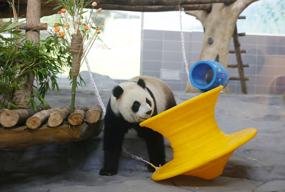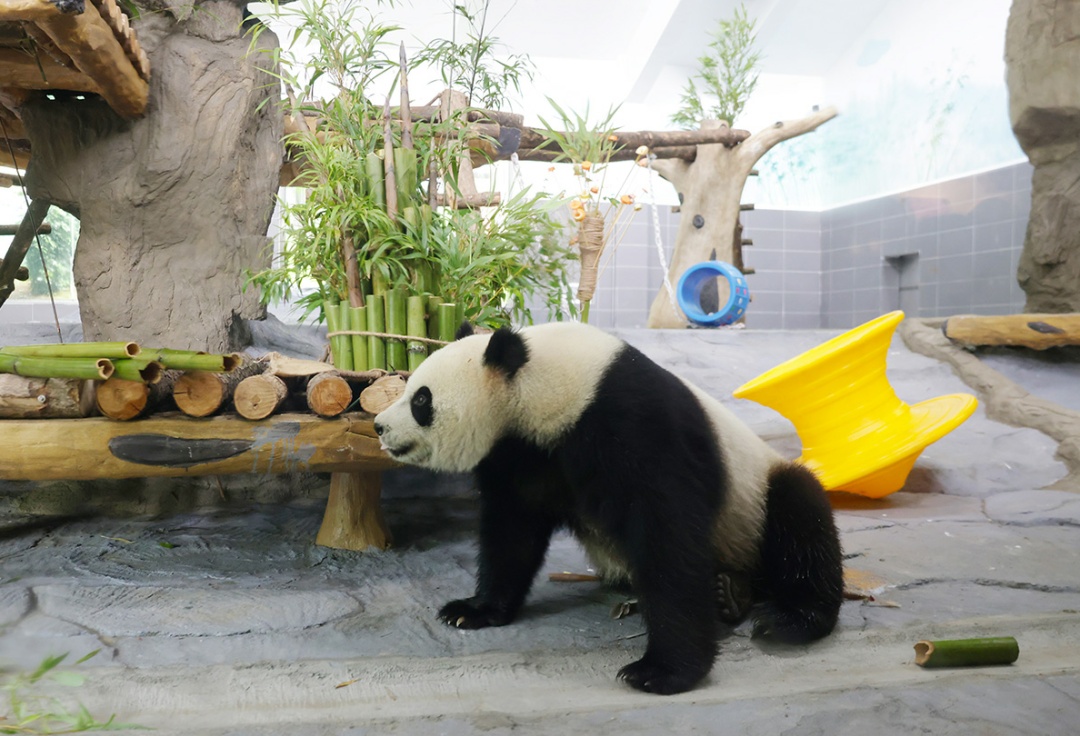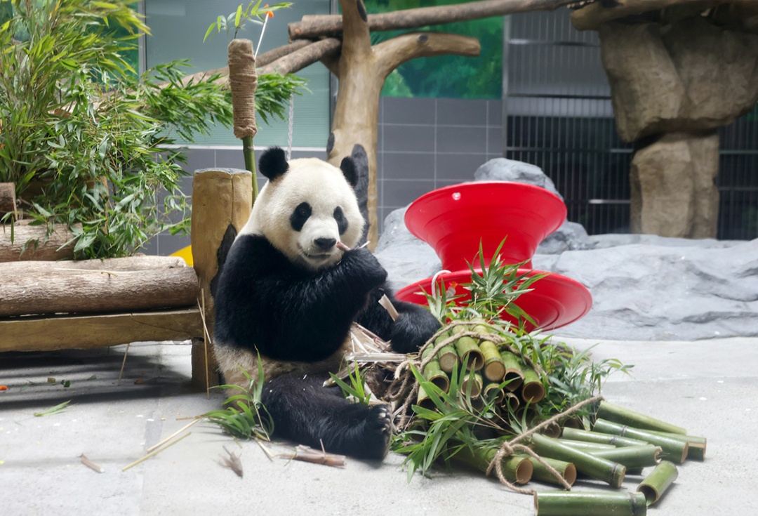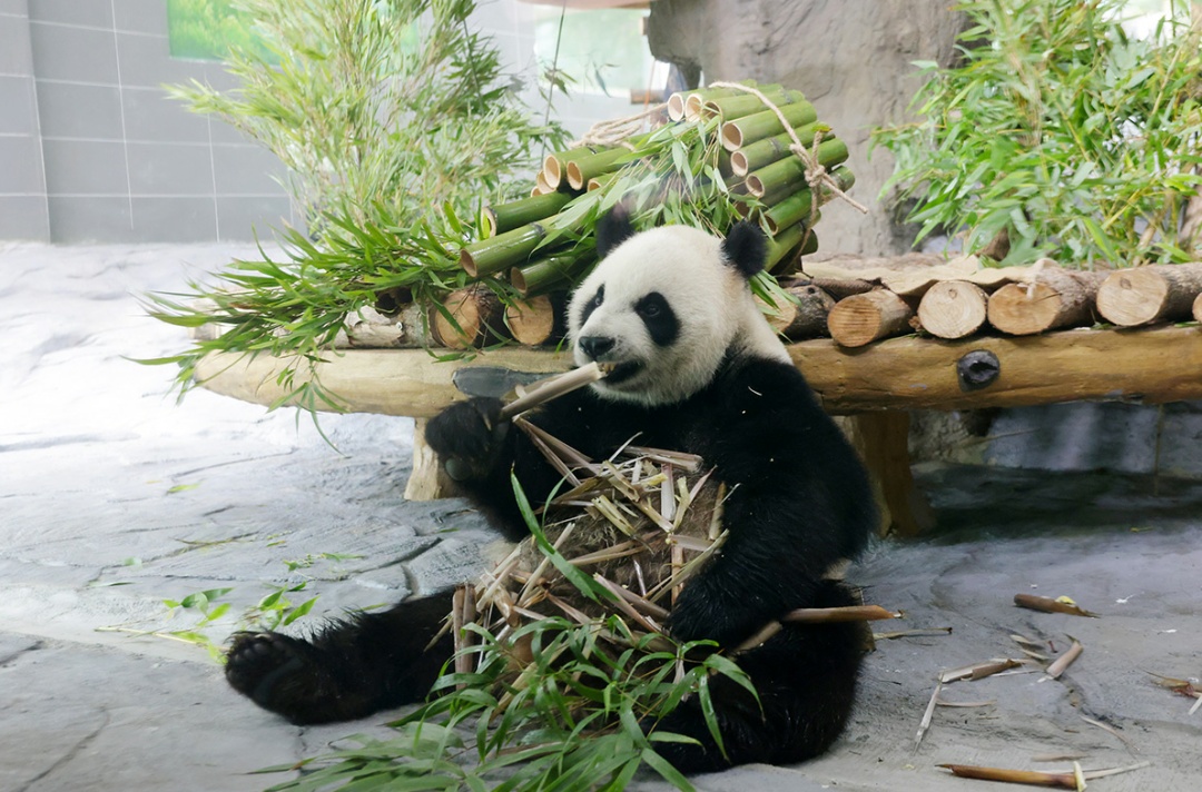 “宝弟”一刻不停地在吃着动物园为它准备的新鲜竹笋,一根接着一根停不下来;“宝妹”则在自己的新家充满好奇,时而摆弄一下玩具,时而靠着歇息。